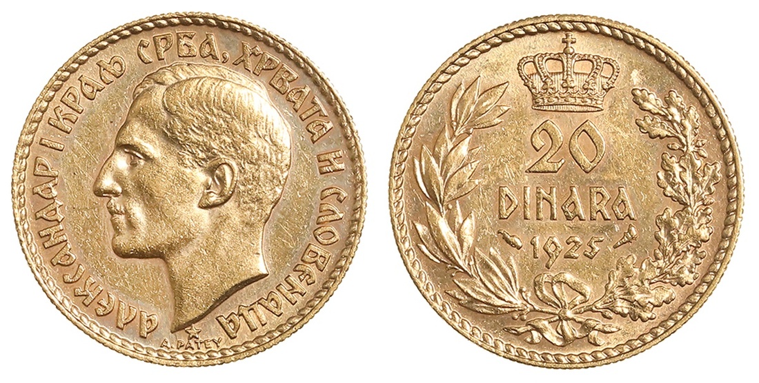 Yugoslavia. Kingdom of the Serbs, Croats and Slovenes. Alexander I (1921-1934). 20 Dinara, 1925. Fr.3, KM 7. Bare head left, rev. Value and date within wreath, crown above. Light hairlines obverse field, small reverse die flaw. Brilliant Uncirculated.