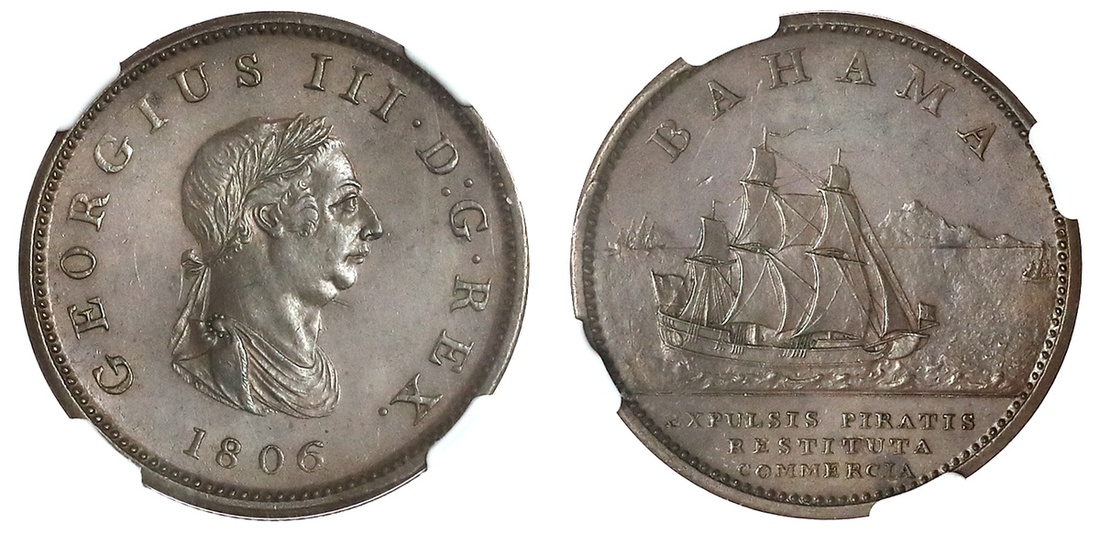 Bahamas. George III (1760-1820). Penny, 1806. Laureate, draped bust right, rev. Full-masted ship sailing right, Pirates Expelled Commerce Restored legend below. KM 1. NGC MS 61 BN.