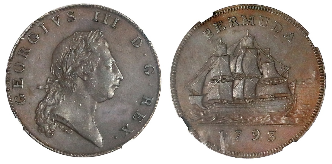Bermuda. George III (1760-1820). Penny, 1793. Laureate head right, rev. Three-masted ship sailing left. KM 5. NGC AU 58 BN.