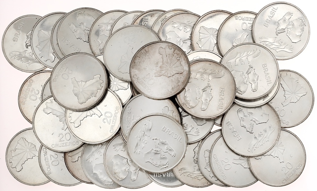Brazil, Roll of Fifty KM-583 20 Cruzieros, Brilliant Uncirculated. 150th Year of Independence. .5520 oz. of silver contained.