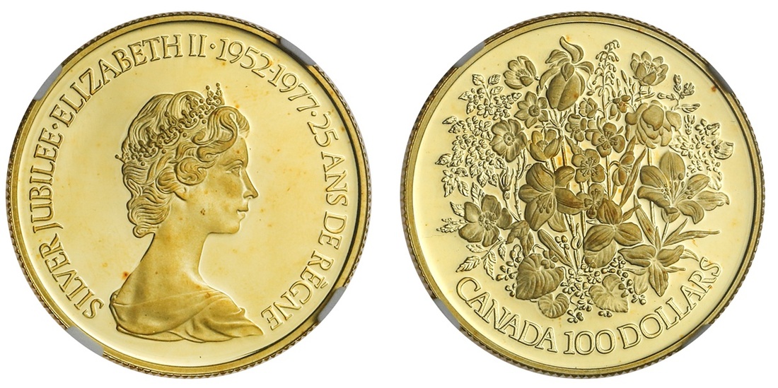 Canada. Elizabeth II (1952-). 100 Dollars, 1977. The Queen's Silver Jubilee. Young bust right, rev. Bouquet of Provincial flowers. KM 119. With original case and certificate. NGC PF 68 ULTRA CAMEO.