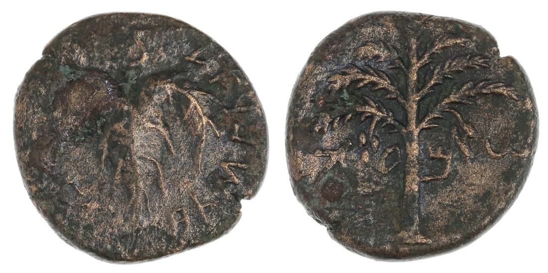 Judaea. Bar Kochba Revolt (132-135). AE 24.5 mm. Undated, attributed to Year 3. 9.29 gms. Vine leaf on tendril; Hebrew legend: For the Freedom of Israel, rev. Palm tree, Shim-on. Meshorer 211. Tan-brown over some roughness. Very Fine.