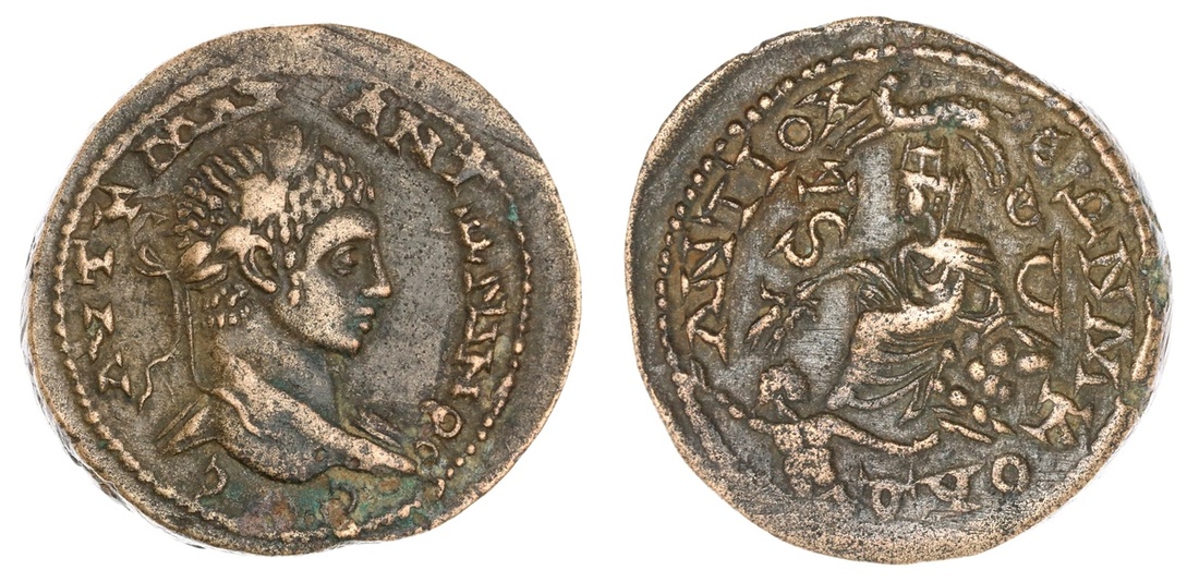 Roman Provincial. Elagabalus (218-222). AE 34 of Antioch in Seleucis ad Pieria Laureate bust right, slight drapery on left shoulder, rev. Antiochene Tyche seated left on rocks, holding grain ears, river-god Orontes swimming left below, ram springing left above. SNG-Copenhagen 251. Good Very Fine.