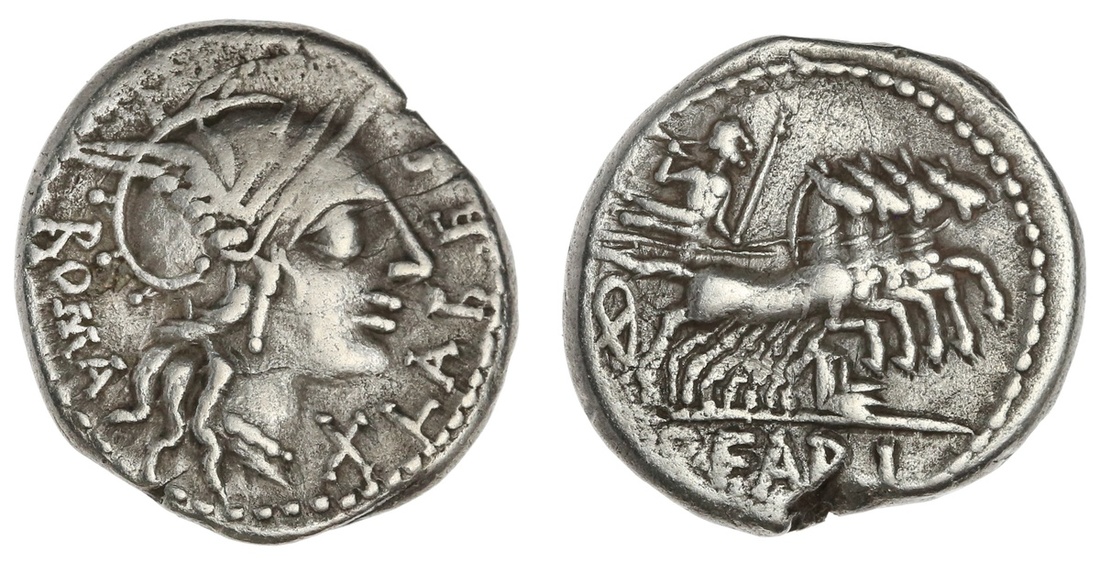 Roman Republic. Q. Fabius Labeo. AR Denarius, 124 BC. 3.71 gms. Helmeted Roma head right, rev. Jupiter driving quadriga right, prow below. Craw.273/1, Syd.532, Fabia 1. Very Fine.