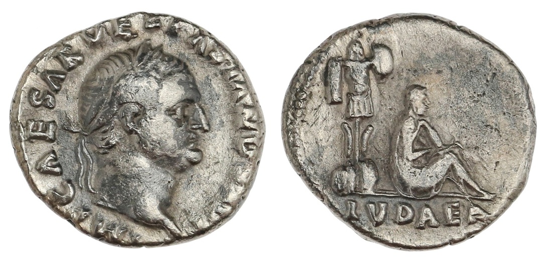 Roman Imperial. Vespasian (69-79). AR Denarius, struck 69-71. 2.87 gms. Judaea Capta issue. Laureate head right, rev. Jewess in mourning seated right, trophy behind; IVDAEA in ex. RIC 15, RSC 226. Light hornsilver. About Very Fine.