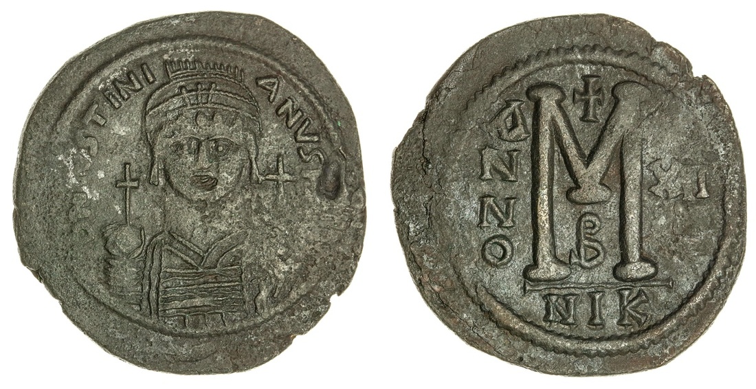 Byzantine Empire. Justinian I (527-565). AE Follis. Nicomedia, 2nd Officina, regnal year 12. 41.5mm, 22.72 gms. Helmeted and cuirassed bust facing holding globus and shield, cross in right field, rev. Large M, cross above, B below; NIK in ex. SB 201. Deep olive-brown over some roughness and porosity. Very Fine.