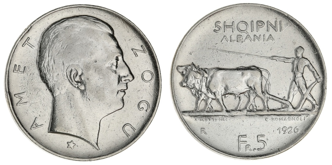 Albania. Ahmed Bey Zogu, as President (1925-1928). 5 Franga Ari, 1926 R. Roma. Bare head right, rev. Farmer plowing left. KM 8.1. Once cleaned, contact marks. About VF.