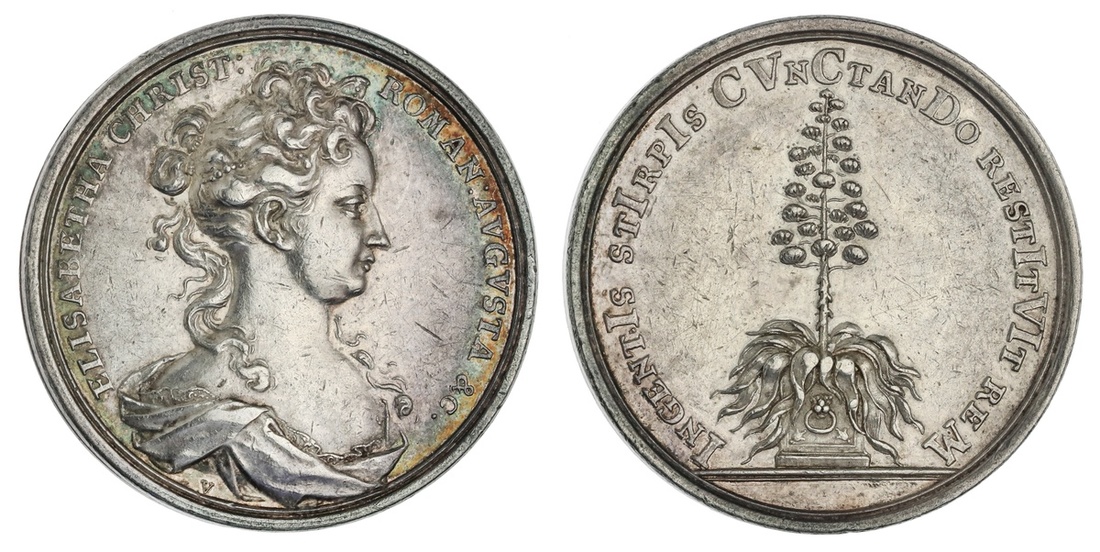 Austria - Holy Roman Empire. Empress Elisabeth Christine v. Brunswick-Wolfenbüttel (1711-1740). On the Birth of Crown-Prince Leopold, 1716. Medal. Silver, 32.2mm. 15.71 gms. By Georg Wilhelm Vestner. Draped bust of the empress right, signed V below, rev. Aloe in bloom; INGENTIS STIRPIS CVNCTANDO RESTITVIT REM (chronogram date) around. A few minor nicks. Extremely Fine.
