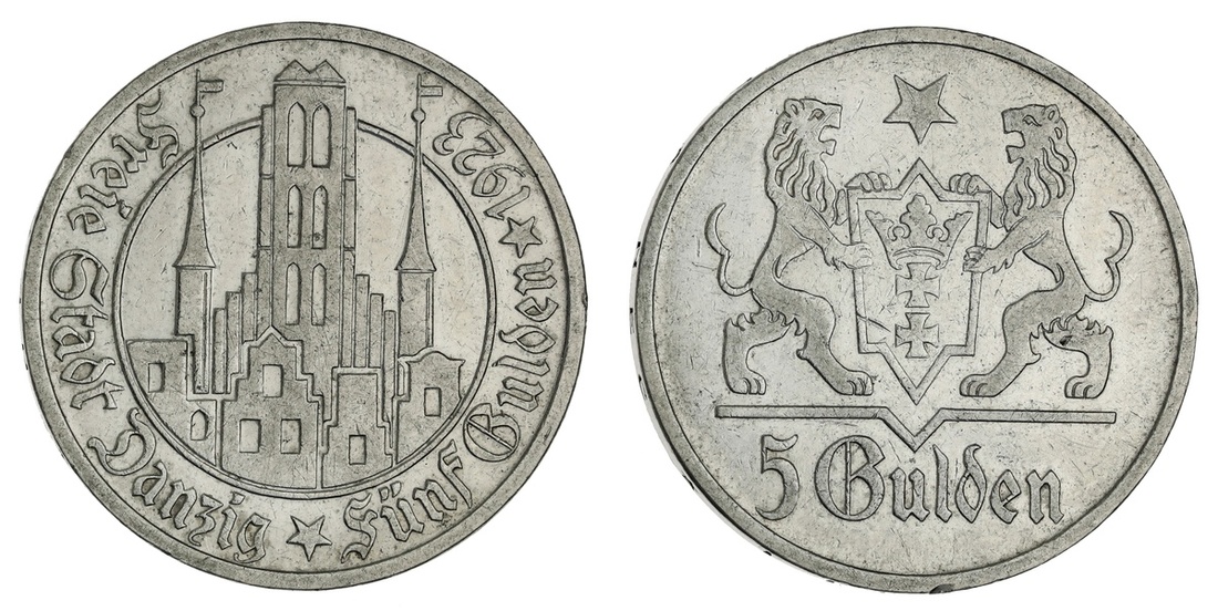 Danzig. Freiestadt. 5 Gulden, 1923. Marienkirche within circle, rev.. Supported Arms. KM 147. Extremely Fine.