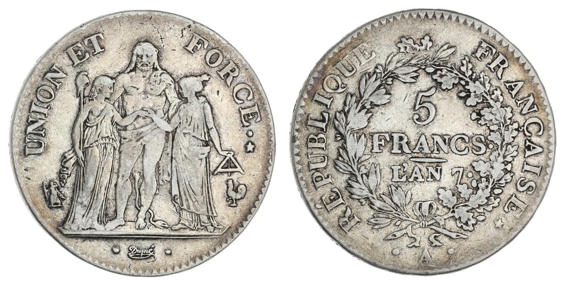 France. Directory. 5 Francs, L'an 7 A (1798-1799). Paris. Hercules Group. KM 639.1. Very Fine.