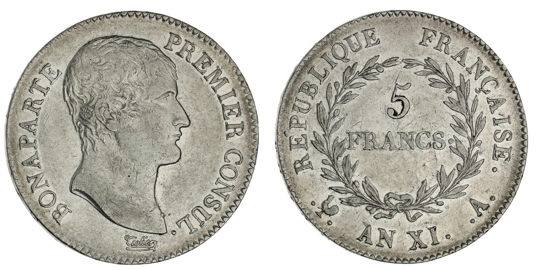 France. Napoleon as First Consul (1799-1804). 5 Francs, L'An XI (1799) A. Paris. Dots flank privy marks. Bare head right by Tiolier; BONAPARTE PREMIER CONSUL, rev. Value within wreath. KM 650.1. Pearly lustre. Good Very Fine.