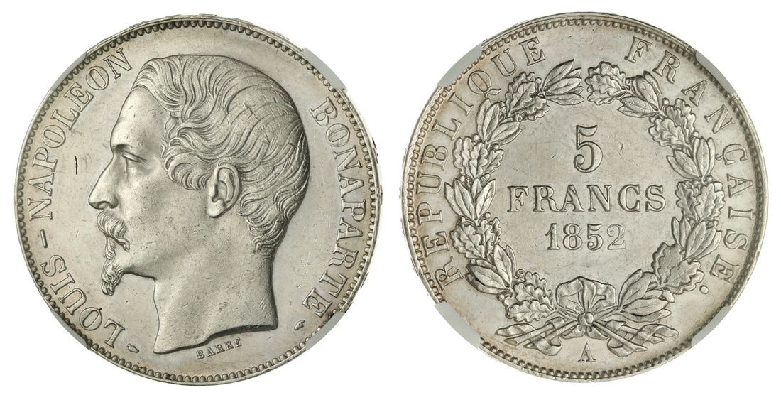 France. Louis-Napoleon Bonaparte, as Prince-President (1851-1852). 5 Francs, 1852 A. Paris. Bare head left by Barre, rev. Value and date within wreath. KM 773.1. NGC AU Details - Rev Cleaned.