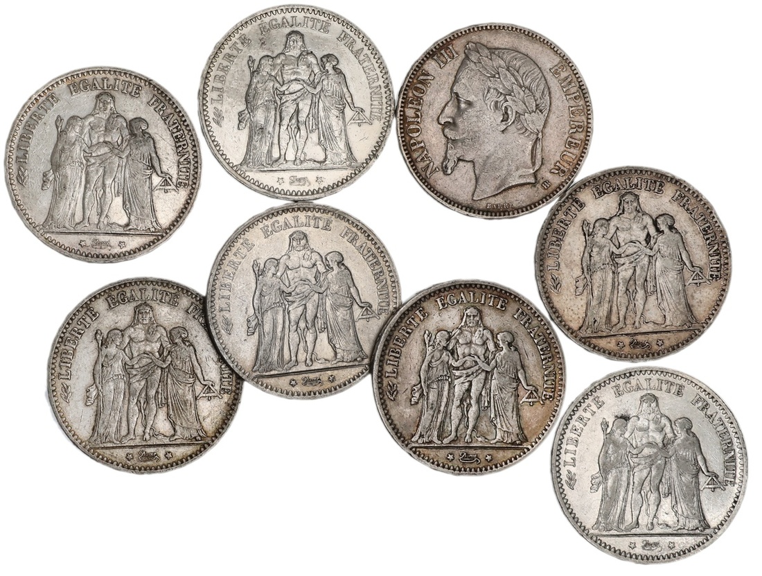 France. Third Republic. Septet of Hercules Group 5 Francs - 1873 (2), 1874, 1875 A (4). KM 820.1; also Napoleon III 5 Francs, 1869 BB. About VF-EF. (8)