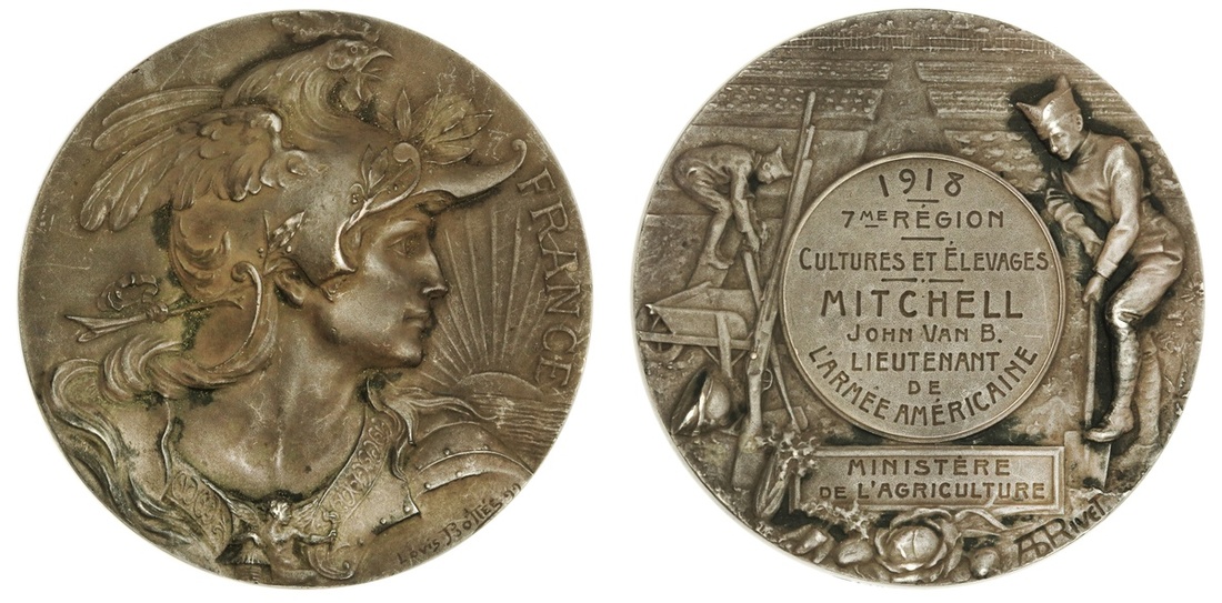 France. World War I. Ministry of Agriculture. Crops and Livestock, Septième Region. Award Medal, 1918. Silver, 48.7mm. By Louis Bottée. Bust of Gallia right wearing rooster helmet, radiant sun before her, rev.Soldiers digging and tilling fields, central medallion with engraved award legend to: "MITCHELL JOHN VAN B. LIEUTENANT DE L'ARMÉE AMÉRICAINE. Toned. Extremely Fine.