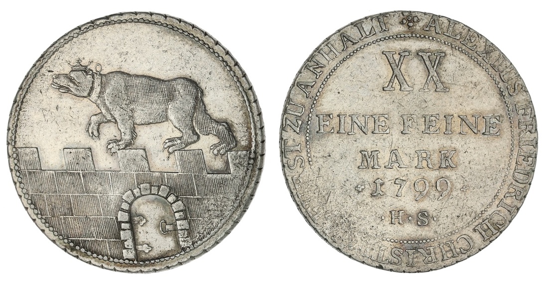 German States. Anhalt-Bernburg. Alexius Friedrich Christian (1796-1834). 2/3 Taler, 1799 HS. Crowned bear padding left along ramparts, rev. XX EINE FEINE, date and initials within beaded circle. KM 71. Some weakness of strike reverse periphery. Extremely Fine.