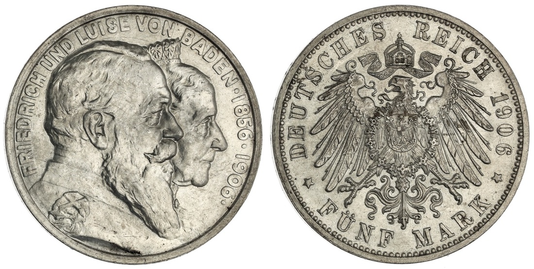 German States. Baden. Friedrich I, as Grand Duke (1856-1907). 5 Mark, 1906. Golden Wedding Anniversary. Conjoined busts of Friedrich and Luise right. KM 277. Frosty white. Brilliant Uncirculated.