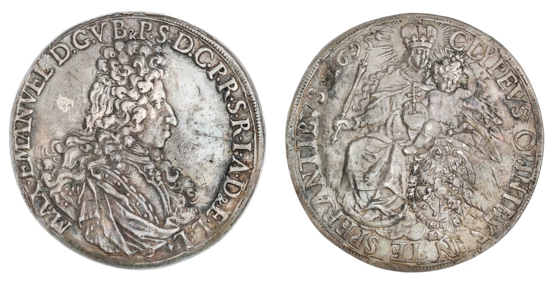 German States. Bavaria. Maximilian II Emanuel (1679-1726). Taler, 1695. Armored, draped and peruked bust right, rev. Madonna and Child. Dav.6101, KM 365.2. Edge has been lightly shaved in the past. Toned over some obverse hairlines. Extremely Fine.