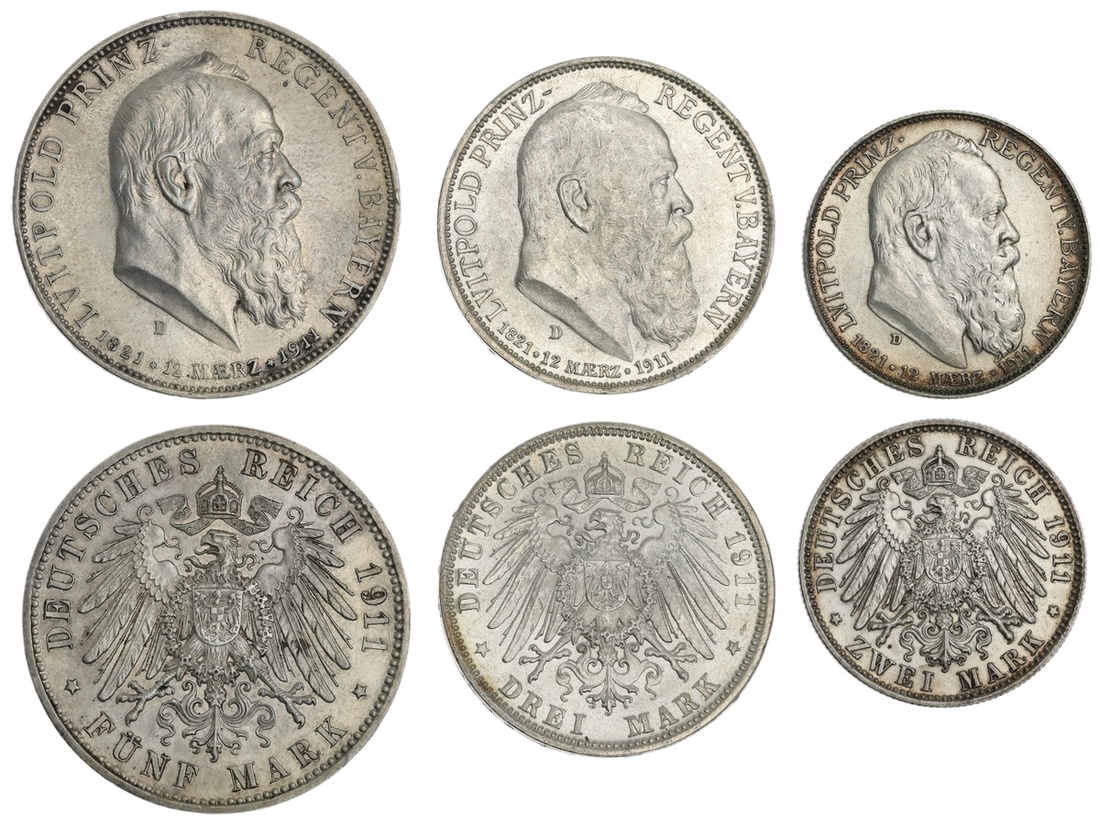 German States. Bavaria. Prince-Regent Luitpold (1886-1912). 90th Birthday of the Prince-Regent Set - 2, 3 and 5 Mark, 1911 D. Bare head right. KM 516-518. Toned AU, Brilliant Uncirculated and AU with some obverse hairlines. (3)