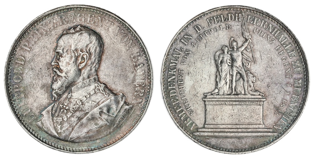 German States. Bavaria. Prince-Regent Luitpold (1886-1912). Medallic Army Monument Double Taler, 1892. 34.61 gms. By A. Börsch. Bust left wearing Order chain, rev. The Monument in Munich. Witt.3065, Geb.202. Toned over light surface marks. Very Fine.