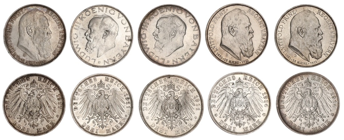 German States. Bavaria. Prince-Regent Luitpold-Ludwig III. Lot. Luitpold - 3 Mark, 1911 D (3). On his 90th Birthday. Choice EF, AU with obverse hairlines and Lustrous AU; Ludwig III. 3 Mark, 1914 D (2). EF and AU. (5)
