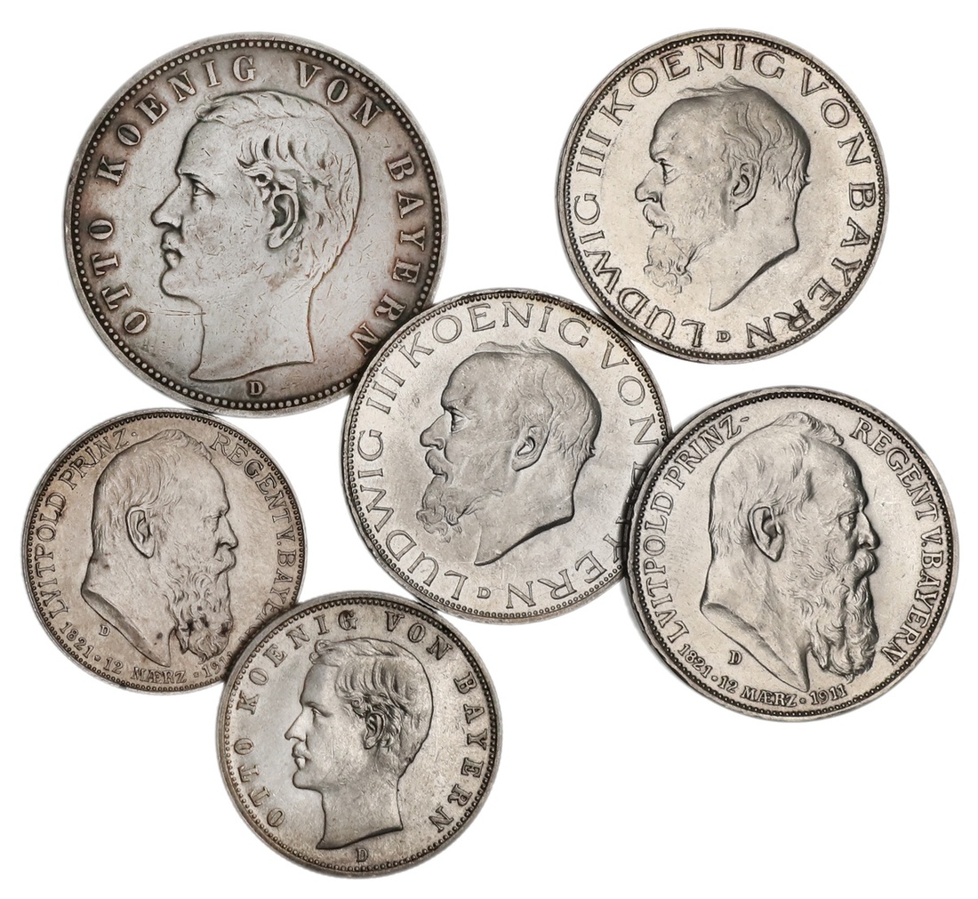 German States. Bavaria. Otto-Ludwig III. Sextet of Kaiserreich issues. Otto. 5 Mark, 1906 D. Fine-VF, 2 Mark, 1908 D. EF; Prince-Regent Luitpold - 2 and 3 Mark, 1911 D. On his 90th Birthday. AU with a few dark spots, and AU; Ludwig III. 3 Mark, 1914 D (2). AU and Unc. (6)
