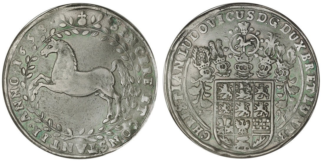 German States. Brunswick-Luneburg-Celle. Christian Ludwig (1648-1665). Taler, 1658 LW. Horse rearing left within wreath, rev. Quint-helmed Arms, "carousal" horse atop. Dav. 6521, KM 211. NGC XF Details - Plugged (at 1:00).