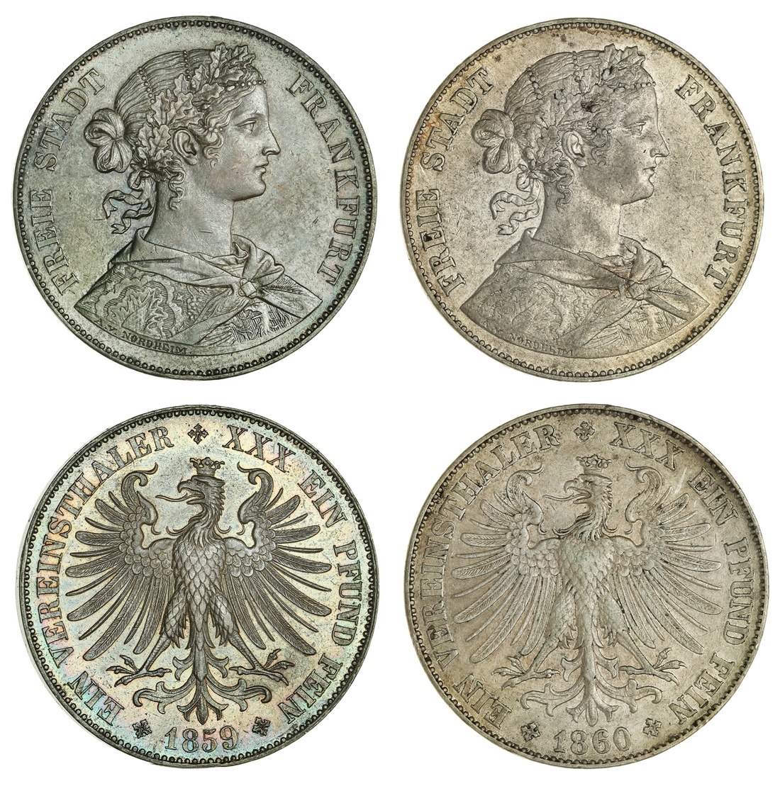 German States. Frankfurt. Freiestadt. Pair of Talers: 1859 and 1860. Maiden's bust right, reputed to have been modeled by Czech actress Fanny Janauschek, rev. Franconian eagle. KM 360. Deep-gray, Choice AU; and Extremely Fine. (2)