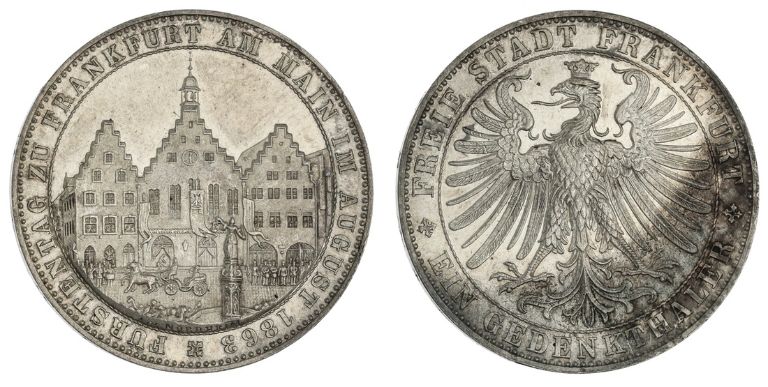 German States. Frankfurt. Freiestadt. Taler, 1863. Assembly of Princes. Römer - Frankfurt City Hall, rev. Franconian eagle. KM 372. Uneven tone band lower reverse. Uncirculated.