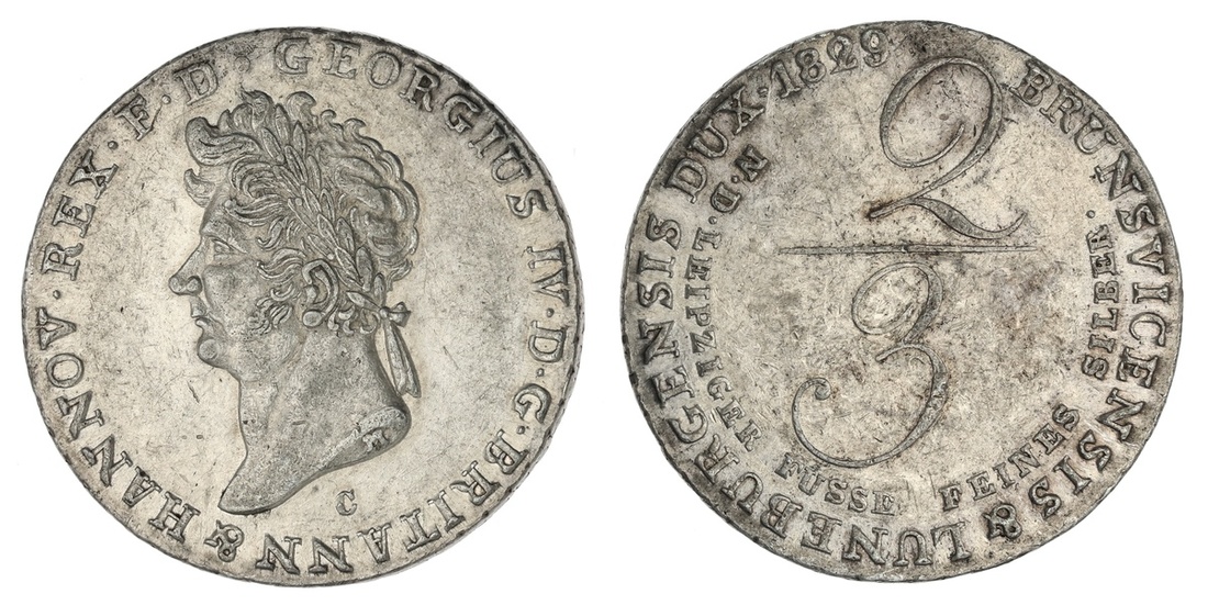 German States. Hannover. Georg IV (1820-1830, George IV of Great Britain). 2/3 Taler, 1829 C. Clausthal. Laureate head left, rev. Large fractional value. KM 140. Linen-white. About Uncirculated.