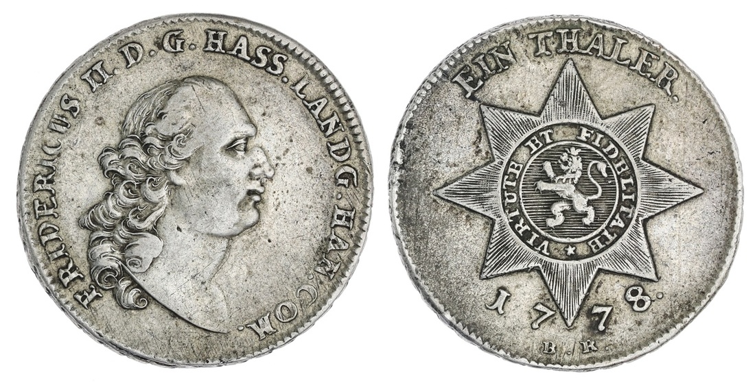 German States. Hesse-Cassel. Friedrich II (1760-1785). Taler, 1778 BR. Peruked head right, rev. Arms on eight-rayed star, date below. KM 516. Good Very Fine.