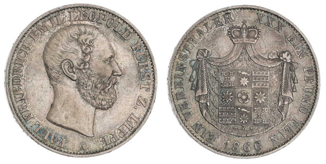 German States. Lippe-Detmold. Paul Friedrich Emil Leopold III (1851-1875). Taler, 1866 A. Bare head right, rev. Crowned and draped Arms. KM 267. Toned. Extremely Fine.