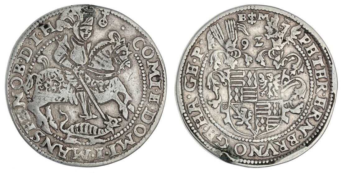 German States. Mansfeld-Friedeburg. Joint Coinage -- Peter Ernst I, Bruno II, Gebhard VIII and Johann Georg IV. Taler, (15)92. Arms surmounted by two helms, rev. St. George slaying dragon. Dav.9510, KM MB 52. Mount mark at 12:00. Very Fine.