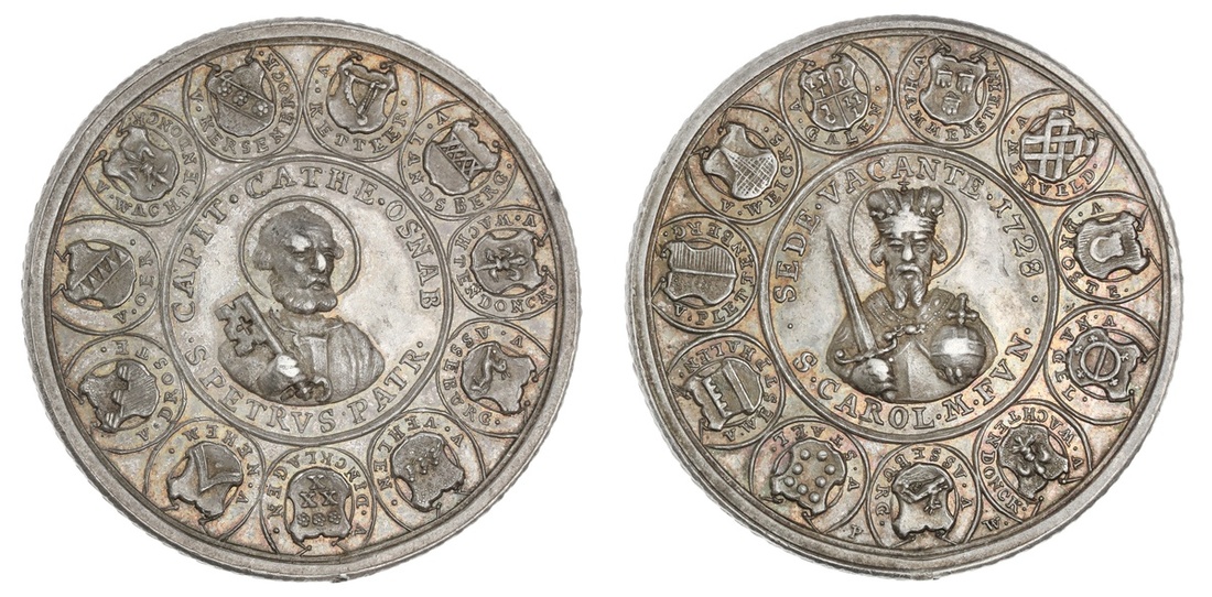 German States. Osnabruck. Sede Vacante. Medallic Taler, 1728. Facing bust of St. Peter ¾ right, holding key; CAPIT. CATHE. OSNAB .S. PETRVS. PATR. around, outer border of shields, rev. Facing crowned and nimbate bust of Charlemagne; .SEDE. VACANTE. 1728. S.CAROL. M. FVN. around, outer border of shields. KM 257. Toned. Choice About Uncirculated.