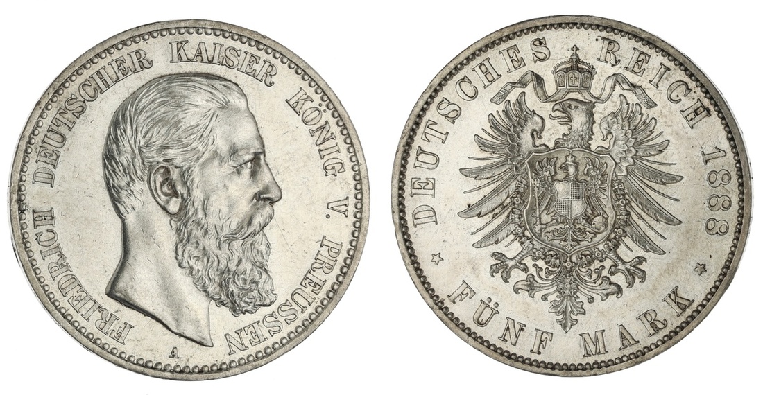 German States. Prussia. Friedrich III (March-June 1888). 5 Mark, 1888 A. Bare head right. KM 512. Uncirculated.