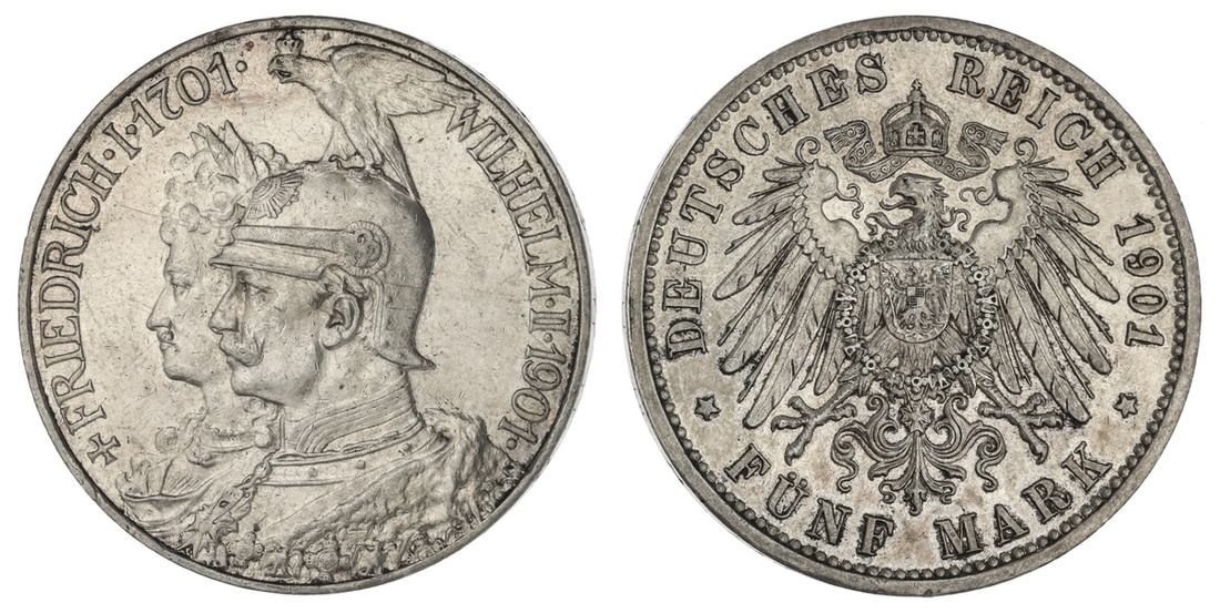 German States. Prussia. Wilhelm II (1888-1918). 5 Mark, 1901 A. Bicentennial of the Kingdom. Conjoined busts of Wilhelm II, helmeted, and Friedrich I, laureate left. KM 526. About Uncirculated.