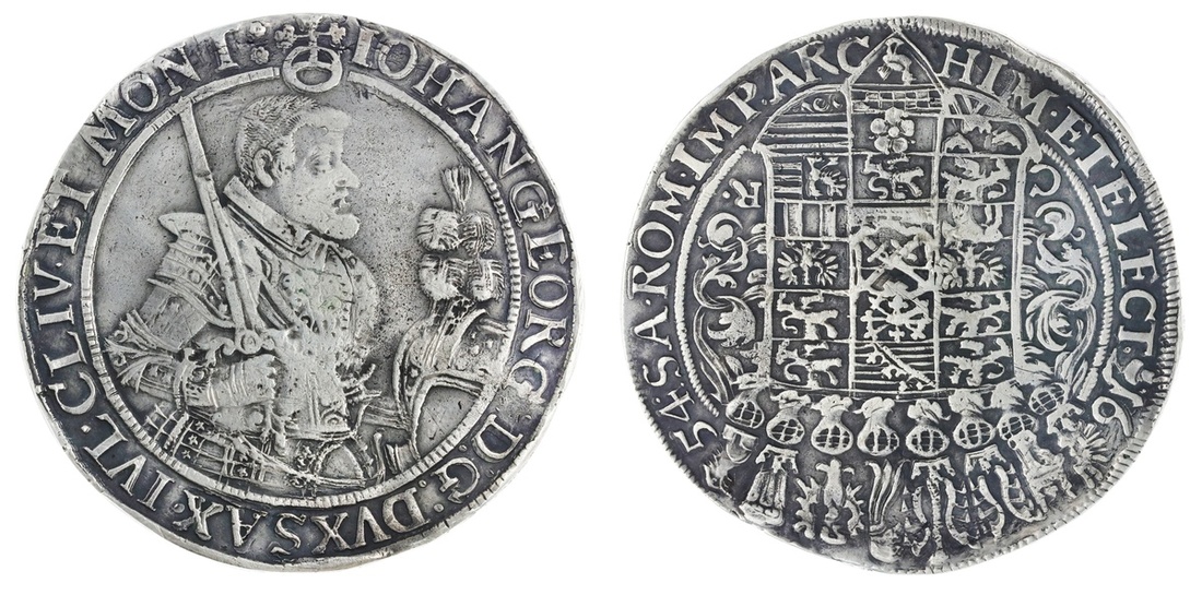 German States. Saxony-Albertine. Johann Georg I (1615-1656). Taler, 1654 CR. 28.21 gms. Armored half-figure right, holding sword and helm, rev. Multi-helmeted Arms. Dav.7612, KM 425. Very Fine.