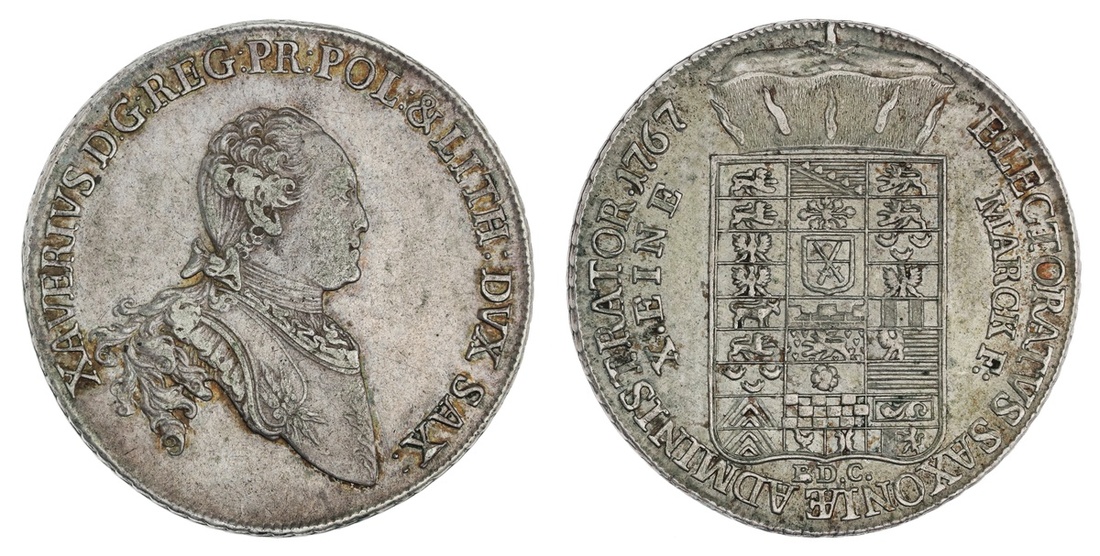 German States. Saxony. Xavier, Prince-Regent (1763-1768). Taler, 1767 EDC. Peruked and cuirassed bust right, rev. Crowned, complex Arms. Dv.2678, KM 976. Good VF/EF.
