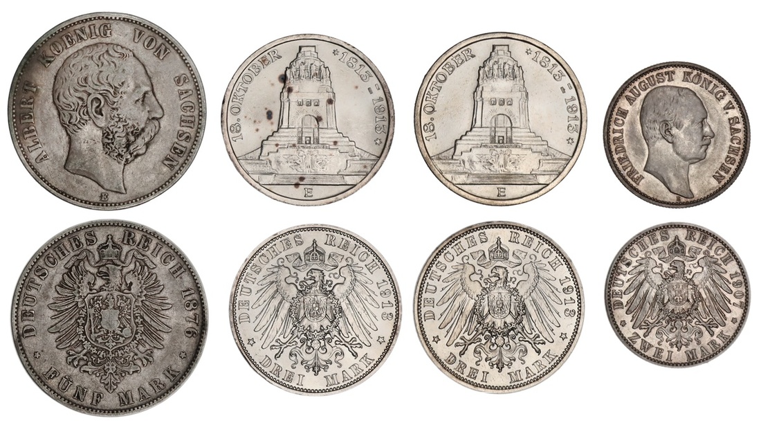 German States. Saxony. Kaiserreich Lot. Albert. 5 Mark, 1876 E. About VF; Friedrich August III. 3 Mark, 1913 E (2). Battle of Leipzig Centennial. One with toning spots. Uncirculated; and 2 Mark, 1907 E. Good VF. (4)