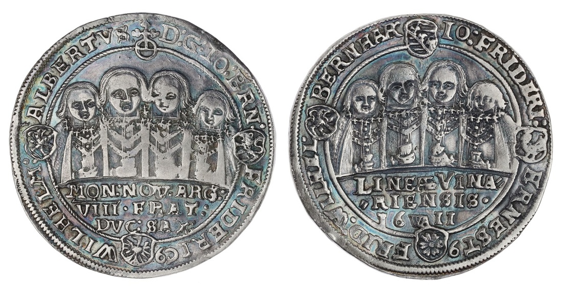 German States. Saxe-Middle-Weimar. Eight Brothers, Joint rule (1605-1619). Half Taler, 1611 WA. Half-figures of four of the brothers facing, rev. The other four facing. KM 4. Toned. About Extremely Fine.