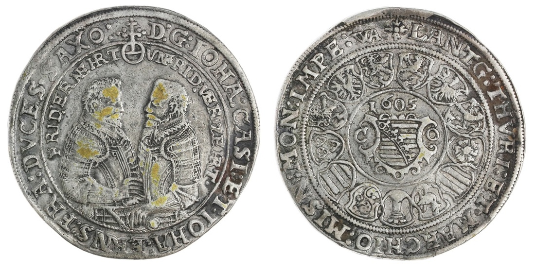 German States. Saxe-Old-Gotha. Johann Casimir and Johann Ernst II. Taler, 1605 WA. Coburg. Wolf Albrecht der Jüngere, mintmaster. Armored half-figures facing each other, orb above and between, rev. Arms, date above, shields around. Dav.7426, KM 5. Traces of gilding on obverse. Very Fine.