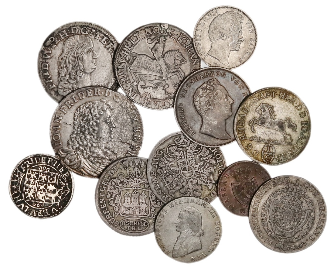 German States. Silver Minor Dozen. Includes: Brunswick-Luneberg-Celle. Halb Reichsort, 1638; Brunswick-Wolfenbuttel. 6 Mariengroschen, 1697 HCH. Some reverse deposits; Brunswick-Luneburg-Calenberg. 2/3 Taler, 1677. Palm on atoll with ships. Surface porosity; Hamburg. 8 Schilling, 1726, 1727 IHL; Mecklenburg-Schwerin. 12 Schilling, 1774; Mansfeld-Eisleben. 1/3 Taler, 1669 ABK. Plugged at 12:00; Brandenburg. 1/3 Taler, 1671 HB. Mount mark; Prussia. 4 Groschen, 1805 A; Baden. Gulden, 1845; Bavaria. ½ Gulden, 1845; also Nassau. Kreuzer, 1842. About VF-Good Very Fine. (12)