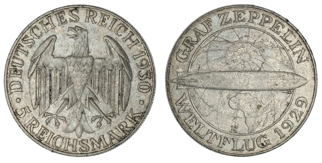 Germany. Weimar. 5 Reichsmark, 1930 E. Muldenhutten. Graf Zeppelin Flight. KM 68. Extremely Fine.