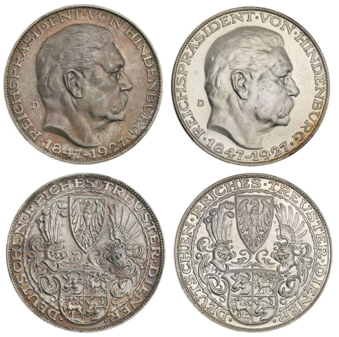 Germany. Weimar. Von Hindenburg's 80th Birthday, 1927. Pair of Medals. Silver, 36mm. By Karl Goetz. Bare head right, rev. Helmeted family crest. Brilliant Proof. (2)
