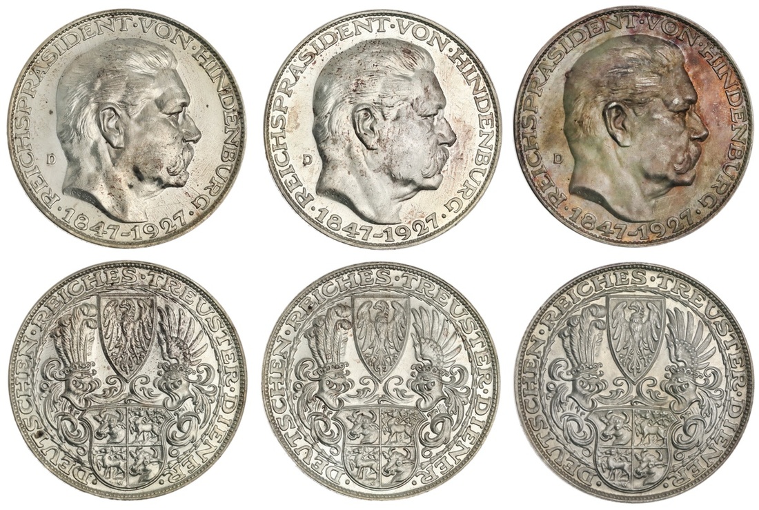 Germany. Weimar. Von Hindenburg's 80th Birthday, 1927. Trio of Medals. Silver, 36mm. By Karl Goetz. Bare head right, rev. Helmeted family crest. Brilliant Proof. (3)