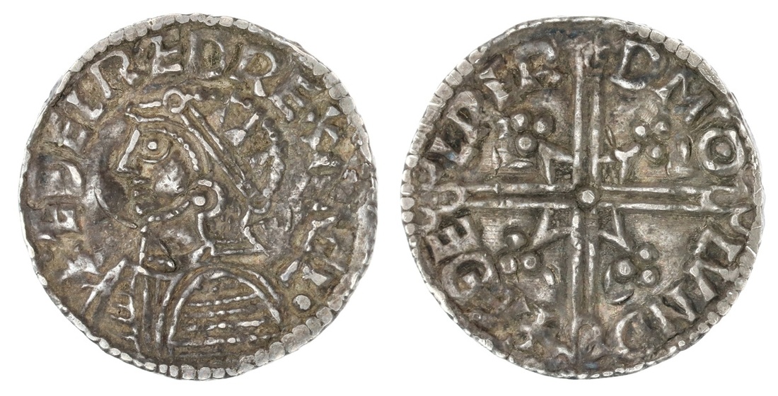 England. Late Anglo-Saxon. Aethelred II (978-1016). Helmet-type Penny. London, moneyer: Aethelwerd. 1.47 gms. Armored bust left wearing radiate helmet; AE?ELRED REX ANGL., rev. Long cross voided, each limb terminating in three crescents, over square with trefoils at each point; AE?ELRERD MO LVND. N.775, S.1152. Nice old toning. Sharp strike. Near Extremely Fine.