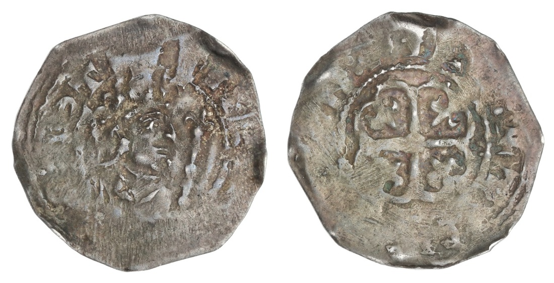 England. Norman Kings. Stephen (1135-1154). Cross Moline ("Watford") Penny, ca. 1136-1145. Wilton, moneyer: Tomas. 1.42 gms. Bust right holding scepter; ST-IEF(NE), rev. Cross Moline, fleur in angles; T(O)M(AS O)N PIL(T). S.1278. Much flatness of strike in peripheries as typical, sharp center. Toned Very Fine.