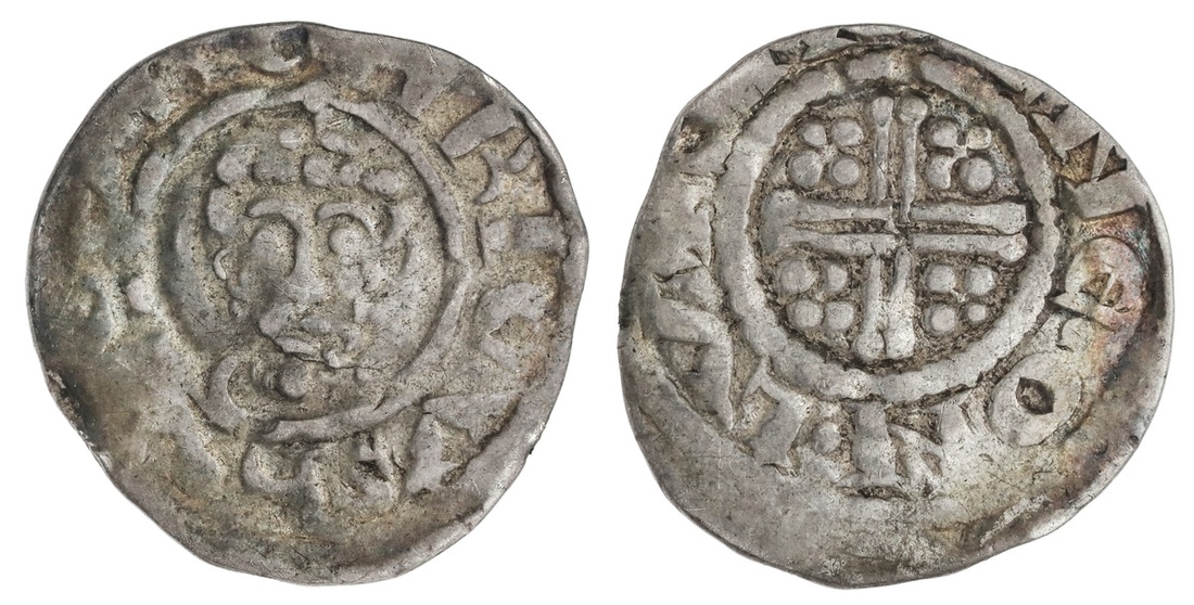 England. Plantagenets. Richard I (1189-1199). Penny. London, moneyer: Stivene. 1.28 gms. Crowned facing portrait, rev. Short cross, cross of four pellets in each angle; +STI(VE)NE ON LV. S.1348A. Some weakness in periphery. About Very Fine.