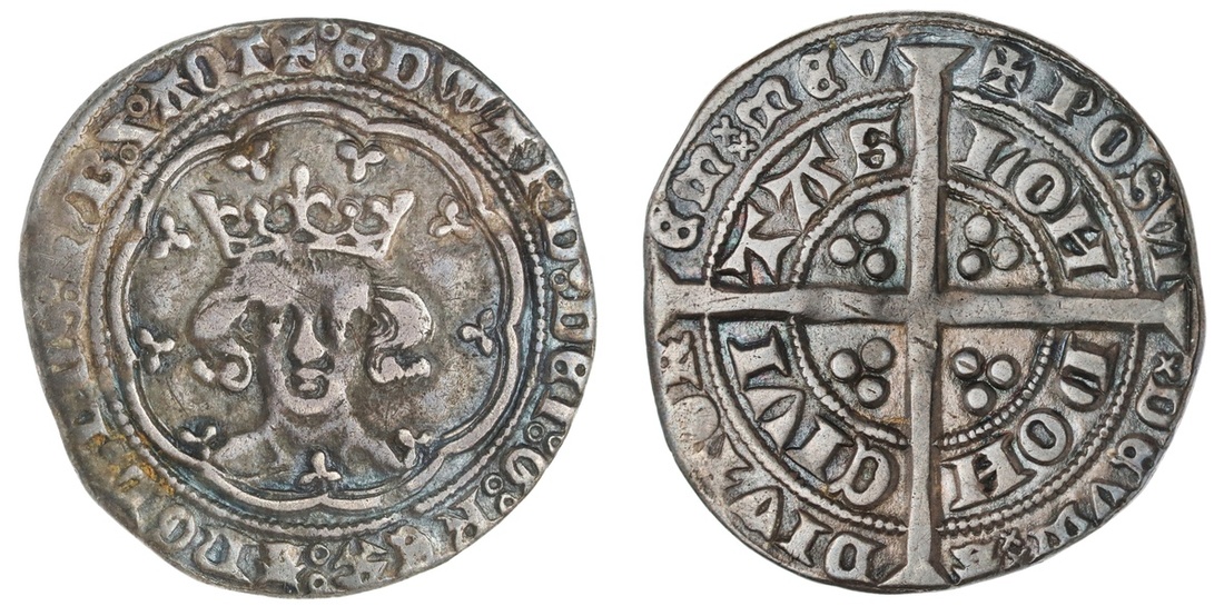 England. Plantagenets. Edward III (1327-1377). Treaty period, 1361-1369. Groat. 4.39 gms. Crowned facing bust in tressure, annulet before EDWARD, rev. Long cross, triplet of pellets in each angle. S.1617. Deep slate gray. Very Fine.