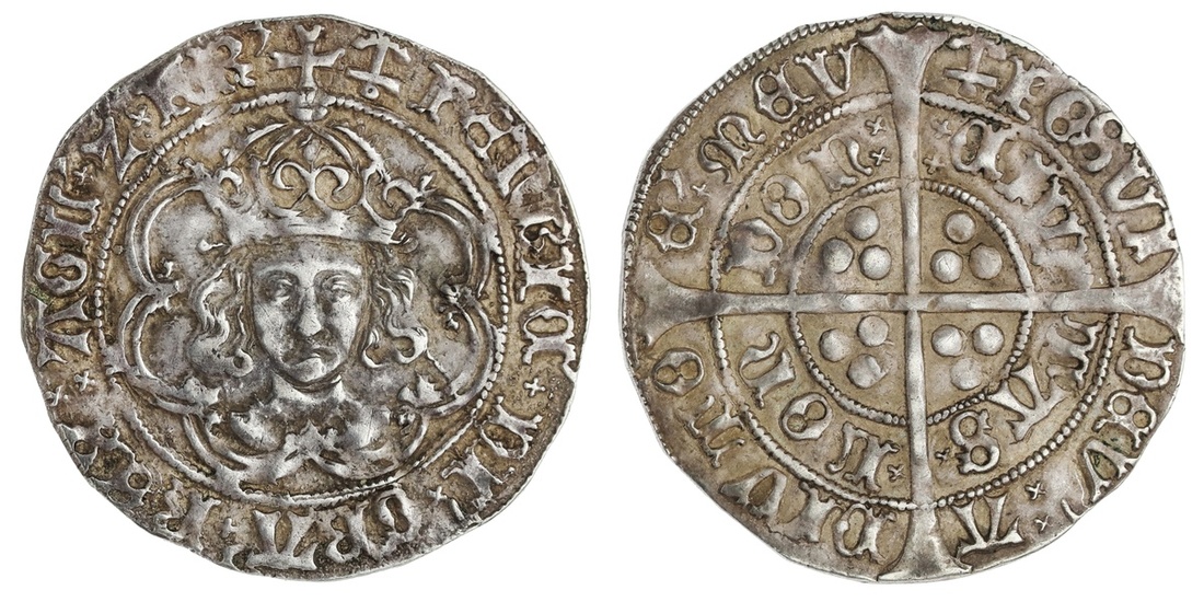 England. House of Tudor. Henry VII (1485-1509). Groat, mm anchor, 1499-1502. 2.84 gms. Crowned facing bust within tressure, rev. Long cross, triplet of pellets in each angle. S.2199. Good Very Fine.