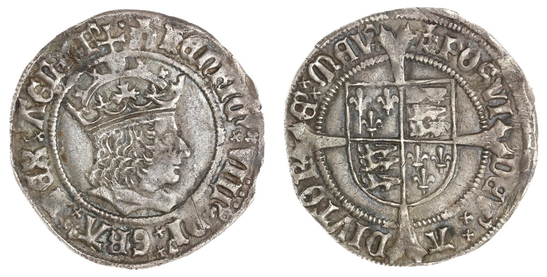 England. House of Tudor. Henry VIII (1509-1547). First coinage, 1509-1526. Groat, mm castle. 2.90 gms. Portrait of Henry VII, rev. Shield over cross fourchee. S.2316. Deep slate-gray. Near Extremely Fine.